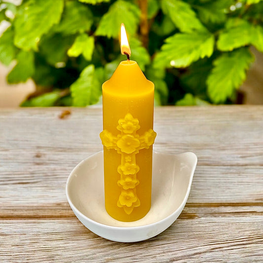 5” pure beeswax religious pillar candle with flower cross- Christian candle gift - candle with cross