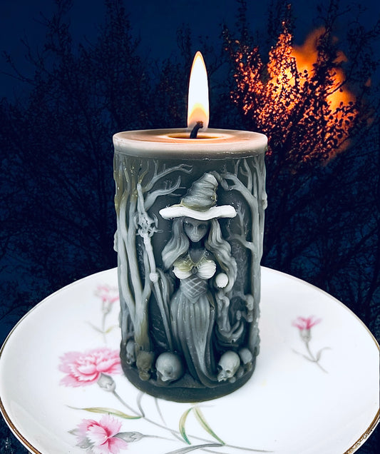 pure beeswax witch with skulls candle - Halloween candle - decorative pillar candle - spell magic ritual altar candle