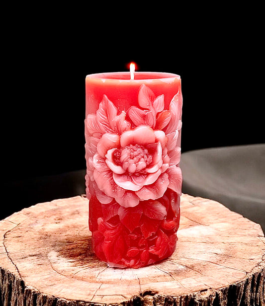 Handcrafted pure beeswax pillar candle designed with peony flowers
