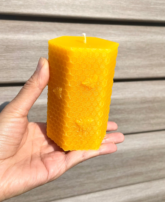 100% Pure beeswax hexagonal honeycomb honeybee pillar candle - candle gift - 3.75”