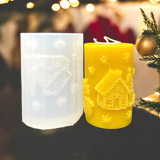 silicone Christmas holiday pillar candle - Christmas house with snowman snowflakes tree 4”