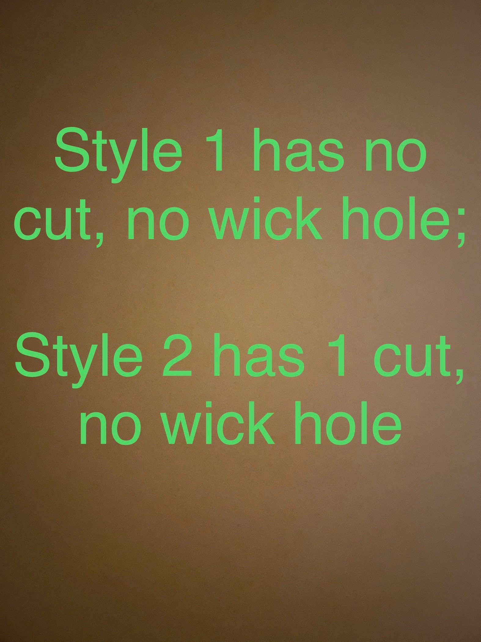 Style 1 has no cut, no wick hole, feel free to make a split for easy release, but you don’t have to.