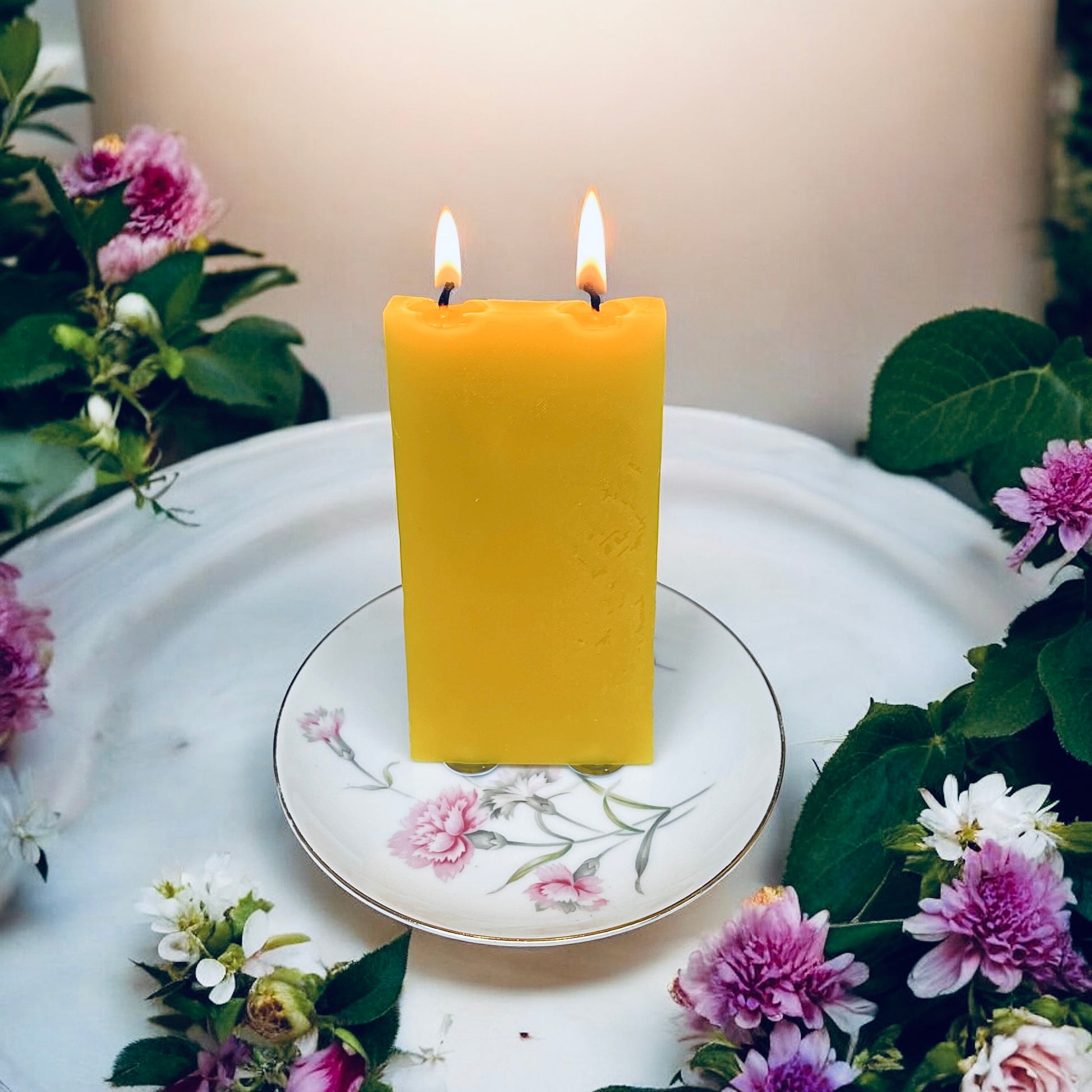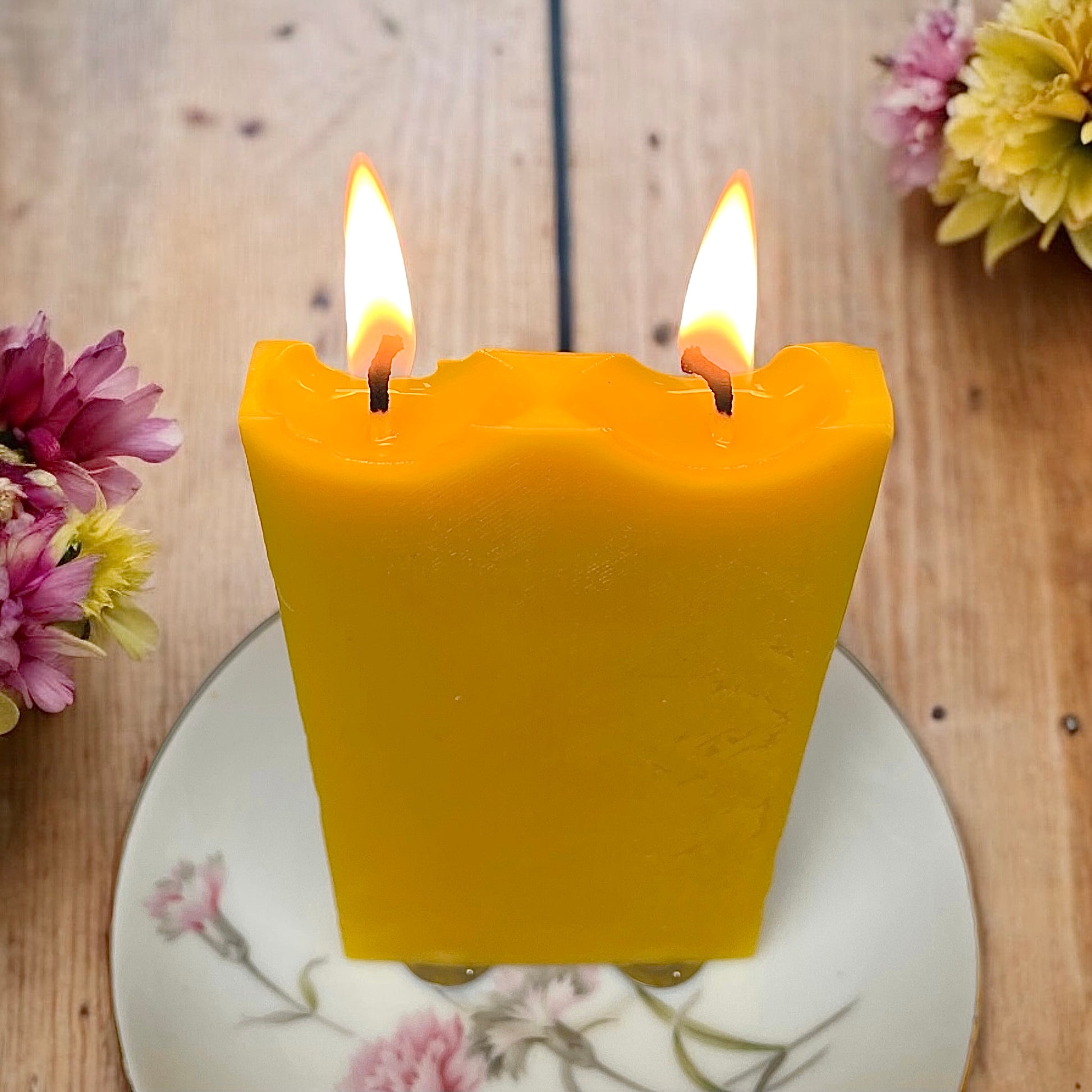 A finished flat candle weighs about 4.7 ozs, my testing candle burns beautifully without dripping.