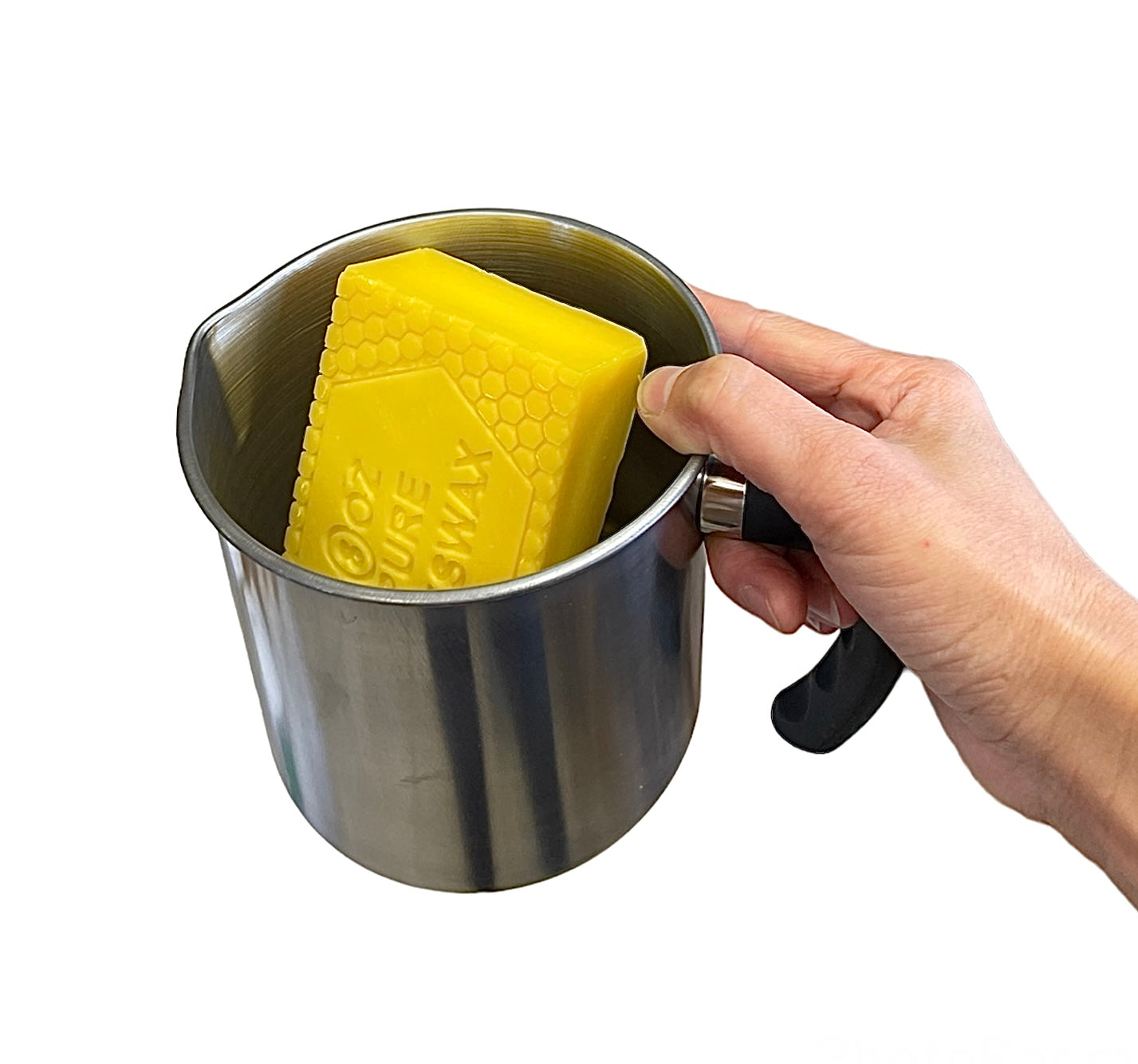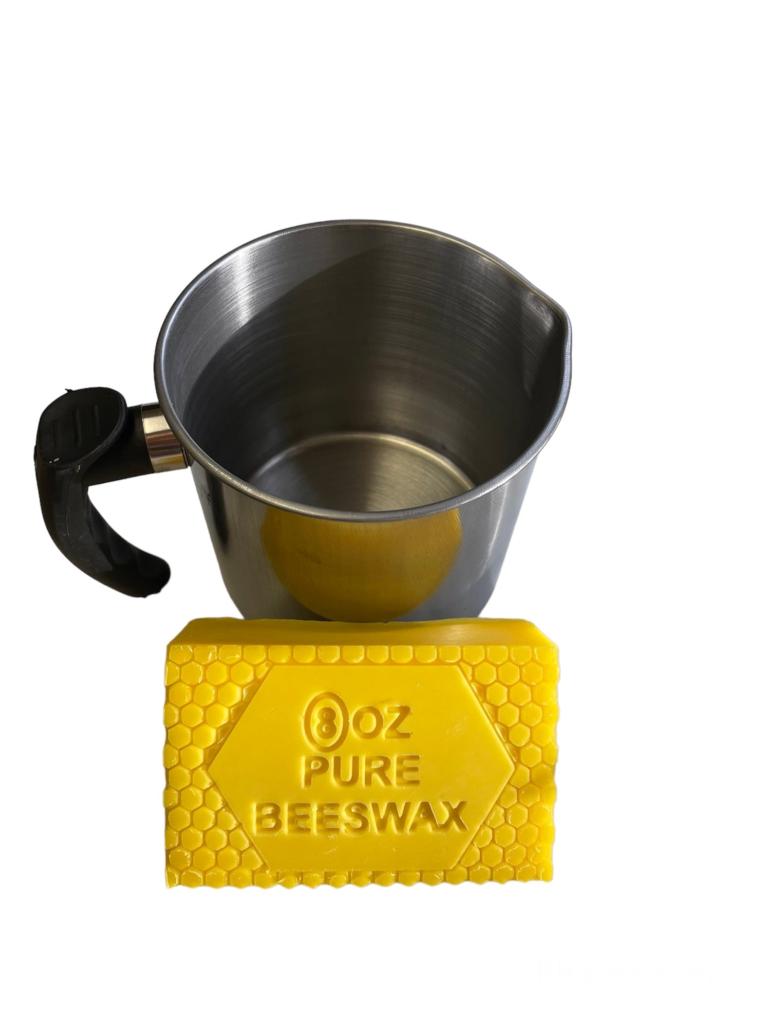 This listing is for one stainless steel candle pouring pot with 1 beeswax block - 8 ozs